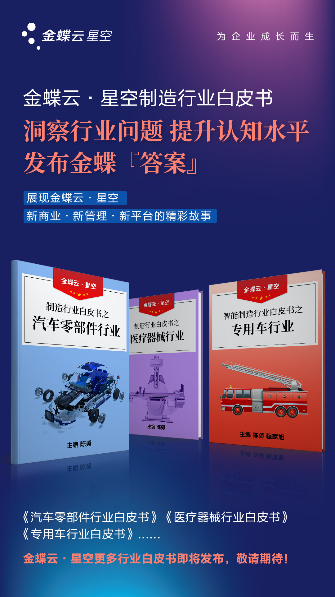 目前,金蝶云·星空制造行業(yè)白皮書已完成3個目錄(汽車零部件、醫(yī)療器械、專用車行業(yè)),由金蝶云·星空智能制造專家陳勇老師、襄陽金蝶智能制造專家程家旭老師,協(xié)同整個金蝶智能制造團隊完成編寫,以行業(yè)數(shù)字化洞察實踐的視角,并結(jié)合行業(yè)產(chǎn)品特征、行業(yè)動態(tài)、解決方案、及標桿實踐,深入淺出剖析了不同制造行業(yè)的企業(yè)上云的實踐應(yīng)用,探索制造企業(yè)轉(zhuǎn)型之路和成長之道。