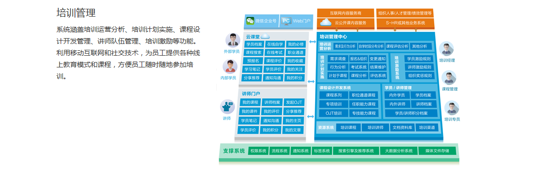 支持企業(yè)人才發(fā)展戰(zhàn)略,幫助企業(yè)構(gòu)建科學(xué)、規(guī)范、全面的員工培養(yǎng)體系。系統(tǒng)涵蓋培訓(xùn)運(yùn)營(yíng)分析、培訓(xùn)計(jì)劃實(shí)施、課程設(shè)計(jì)開發(fā)管理、講師隊(duì)伍管理、培訓(xùn)激勵(lì)等功能,貫穿培訓(xùn)管理全過(guò)程。系統(tǒng)充分利用移動(dòng)互聯(lián)網(wǎng)和社交技術(shù),延伸拓展培訓(xùn)空間和時(shí)間,提供各種線上教育模式和課程,方便員工隨時(shí)隨地參加培訓(xùn),及時(shí)獲得企業(yè)和崗位所要求掌握的各項(xiàng)知識(shí)和技能。